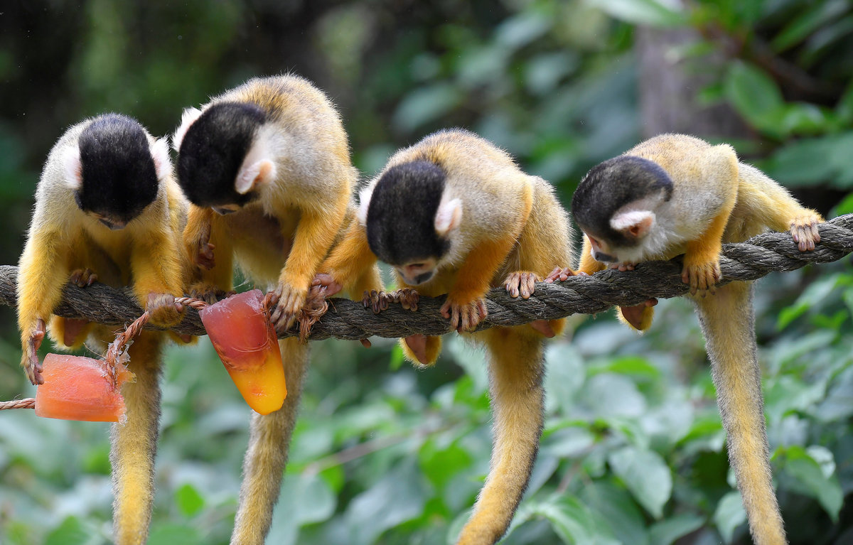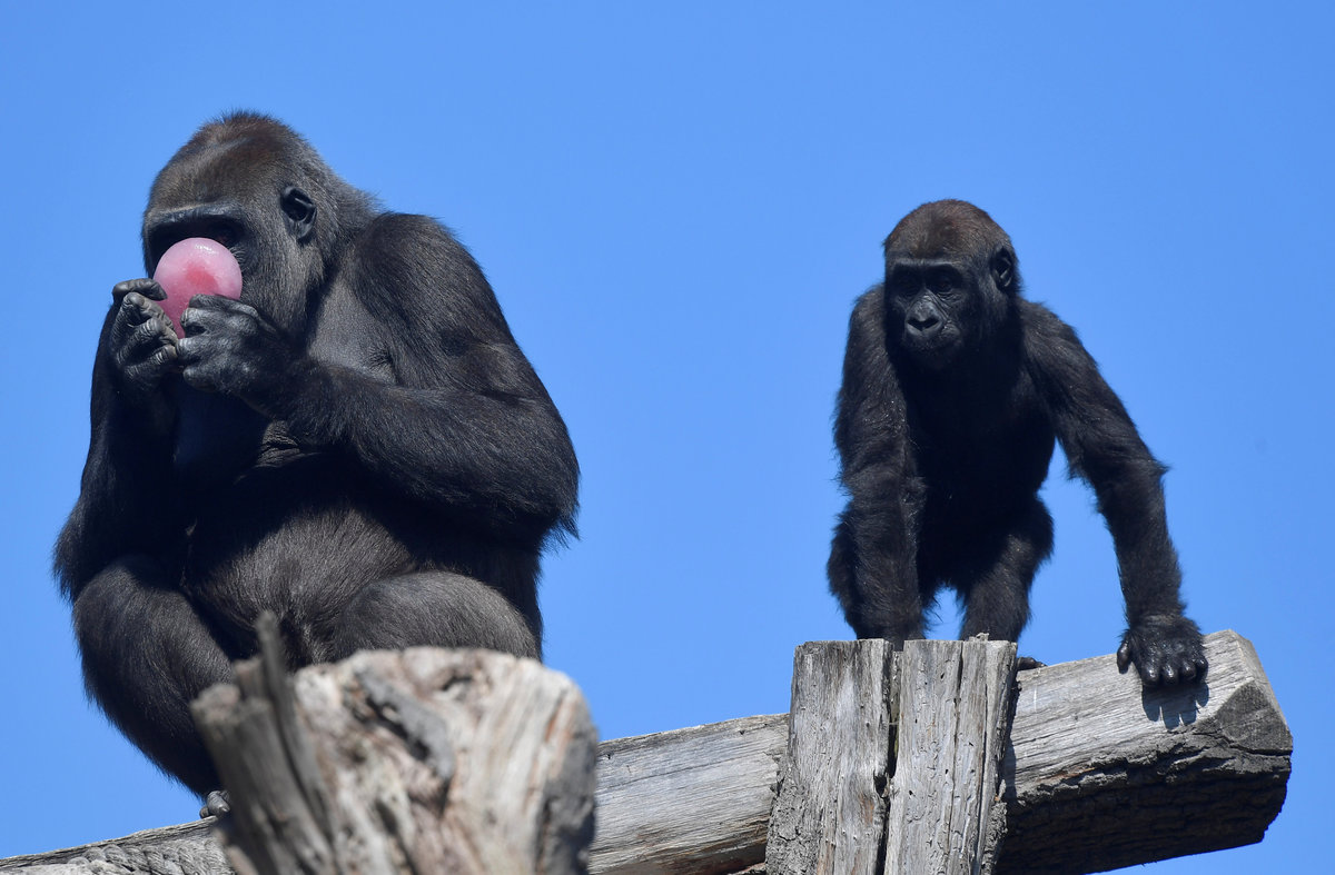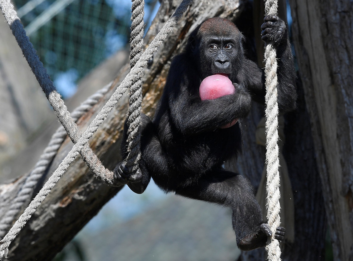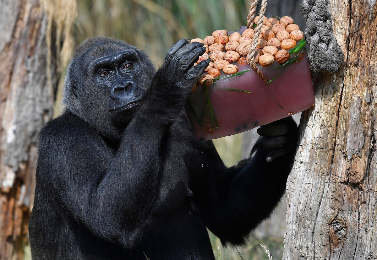 With temperatures hitting 30 degrees Celsius (86F), squirrel monkeys and gorillas, including the zoo's silverback 'Kambuka', munched on frozen mixtures including chickpeas, sunflower seeds, walnuts and sugar-free fruit cordial.