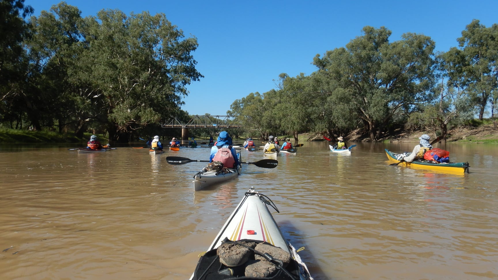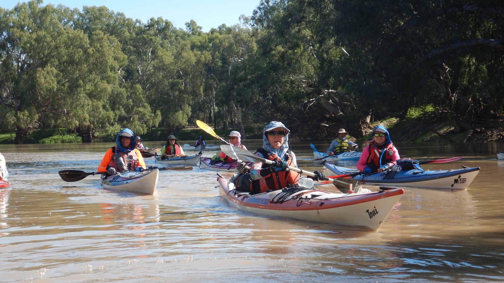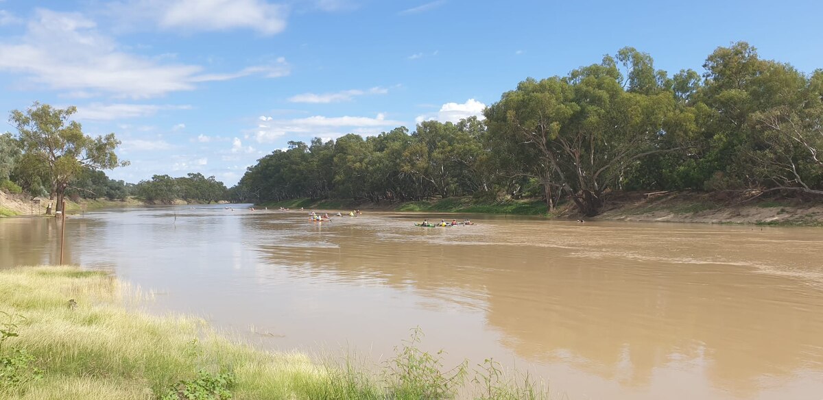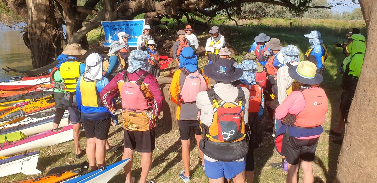 Floodwaters moving downstream into the Darling have made this adventure possible for the group from the Suncoast Seniors Recreational Kayaking Club, with an average age of 71.
