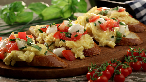 When the eggs are nearly set, fold in chopped ripe tomato, soft fresh mozzarella and plenty of basil. Don't overcook the eggs; rather, leave them soft-set for a luxurious texture. Serve with toasted French baguette slices and a side of fresh berries drizzled with a little balsamic glaze.