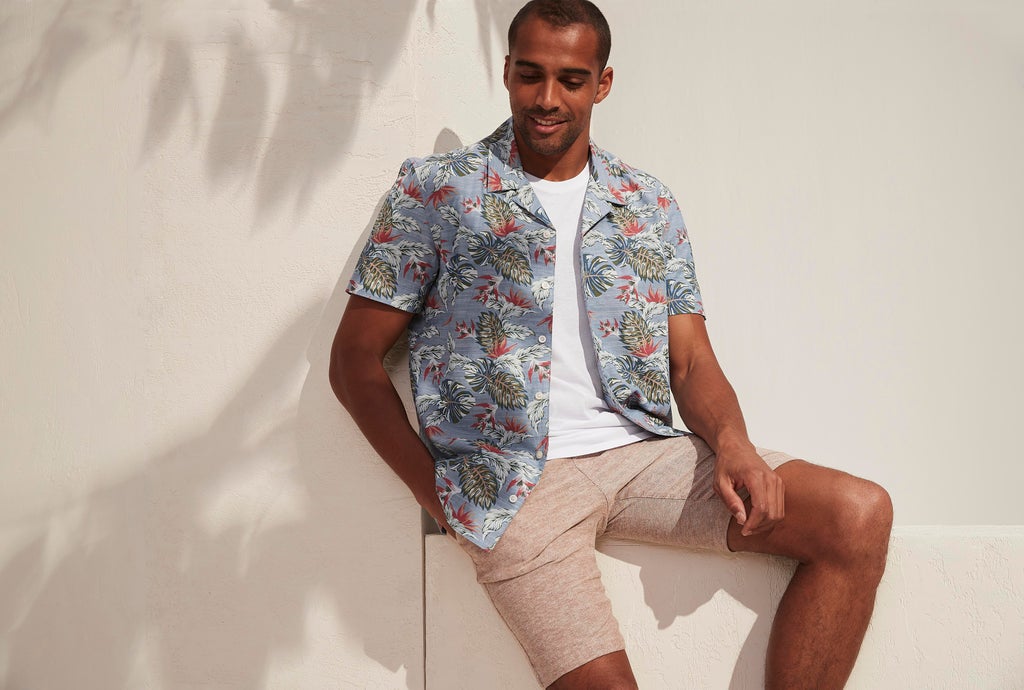 Matalan Short Sleeve Tropical Leaf Print Shirt, £12.50; Slim Fit Crew Neck T-Shirt, £4; Slim Fit Textured Shorts, £16