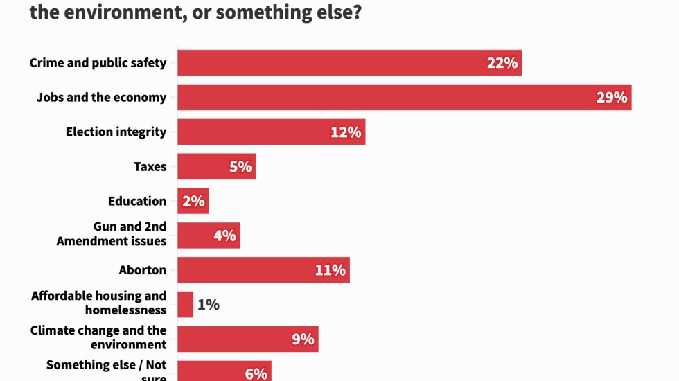 Jobs and the economy were the top concerns for 29% of those polled, followed by crime and public safety at 22%, election integrity at 12%, abortion at 11% and climate change and the environment at 9%. Rounding out the list, taxes were cited by 5%, guns and Second Amendment issues by 4%, education by 2% and affordable housing and homelessness by 1%. Another 6% said they were unsure of their top issue.