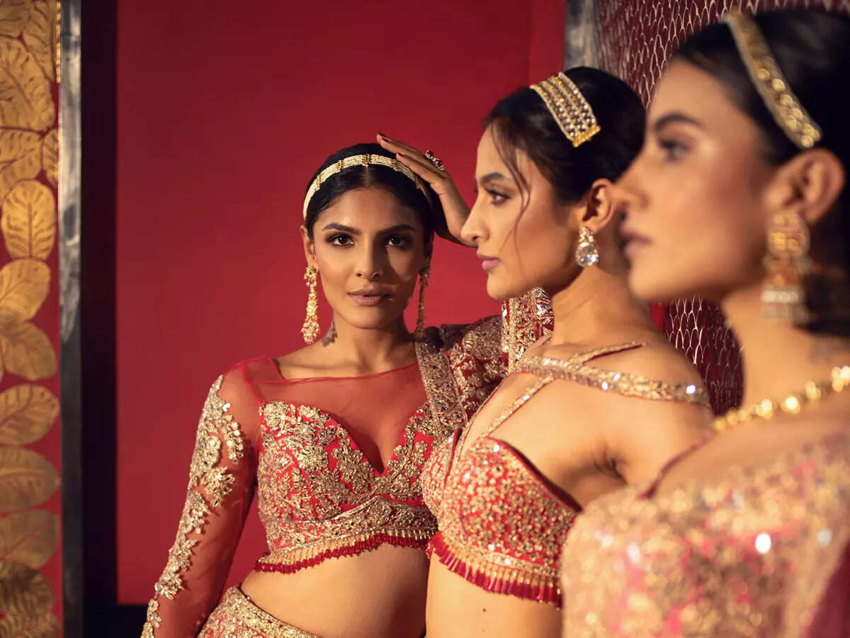 The wedding collection included varied shades of ruby, sindoor, and sienna reds. The embroidery was more lavish in gold zari threadwork with silver zardosi to give it a modern twist.