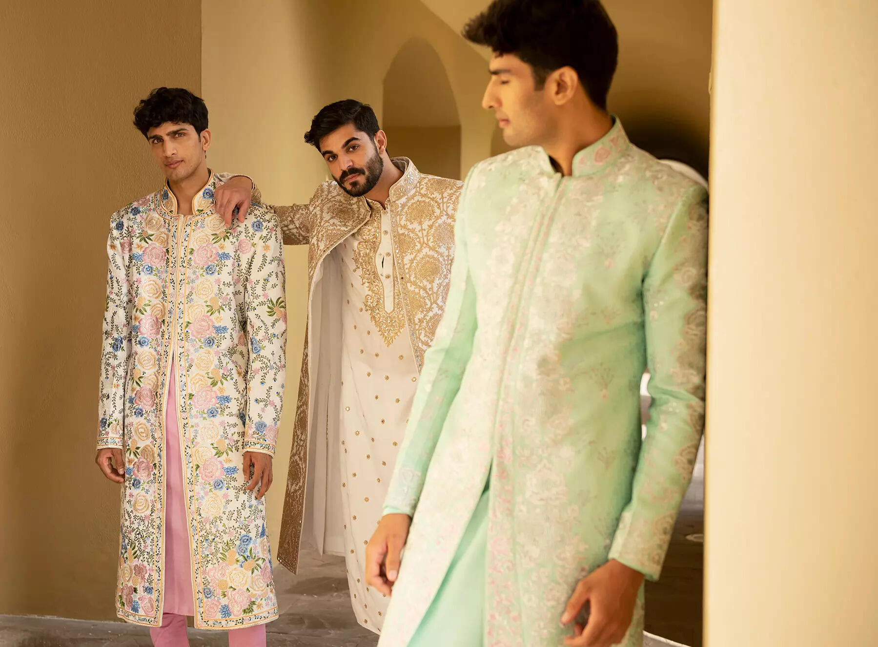 The collection comprised beautiful pastels - in mint, ice-blue, blush, and yellow, with tone-on-tone embroidery in delicate glass beads, crystals, and threadwork for a daytime function in ultra-feminine, soft, flowy silhouettes. Sheer sleeves, off-shoulder necklines, and deep scalloped backs make for a sensual yet modest young bride. The groom wore easy, pastel-colored sherwanis with thread embroidery and modern hemlines.