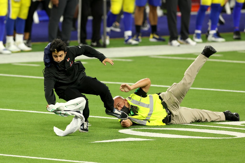 An over-enthusiastic fan was flattened by security after running onto the field during Super Bowl LVI.