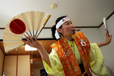 Her cheering style at Olympic venues is well-known among the Japanese. She wears the traditional Japanese costume for festivals and a headband that says “Victory" written in Japanese. In her hands she holds folding fans emblazoned with the Japanese flag.