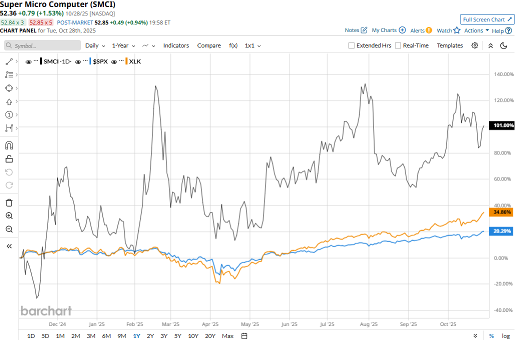 SMCI stock prices have gained 9.7% over the past 52 weeks, notably underperforming the Technology Select Sector SPDR Fund’s (XLK) 31.2% surge and the S&P 500 Index’s ($SPX) 18.3% returns during the same time frame.