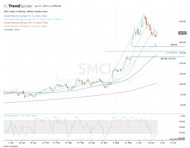 The first comes into play around the $192.50 area, which is the low following the stock’s big gap-up on May 25 when Nvidia reported earnings. That’s also about where the 10-week moving average comes into play.