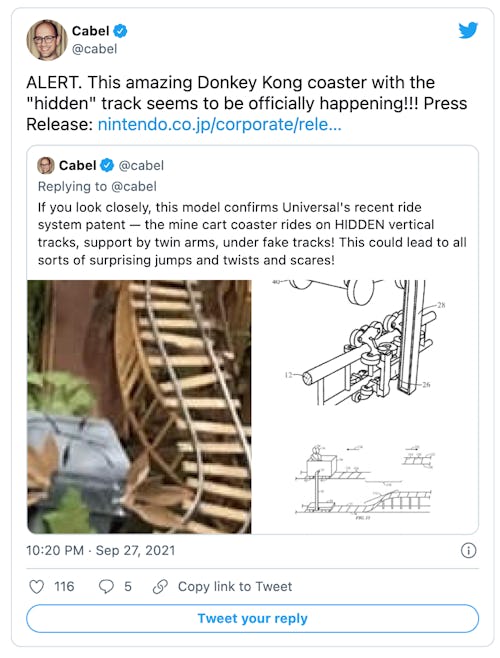 A leaked Universal patent from 2019 shows a unique rollercoaster ride system where a hidden set of tracks lives under fake tracks, which could allow for all sorts of surprising jumps and other scares. It’s been speculated that concept could potentially be used in the Donkey Kong area.