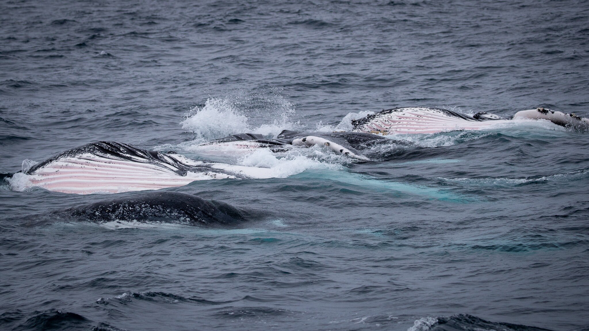 "These whales are turning on their side, opening up their side, they don't have any hair, the white on the underside, that white there is their throats opening up and the pointy bit, that's the top of their mouths.