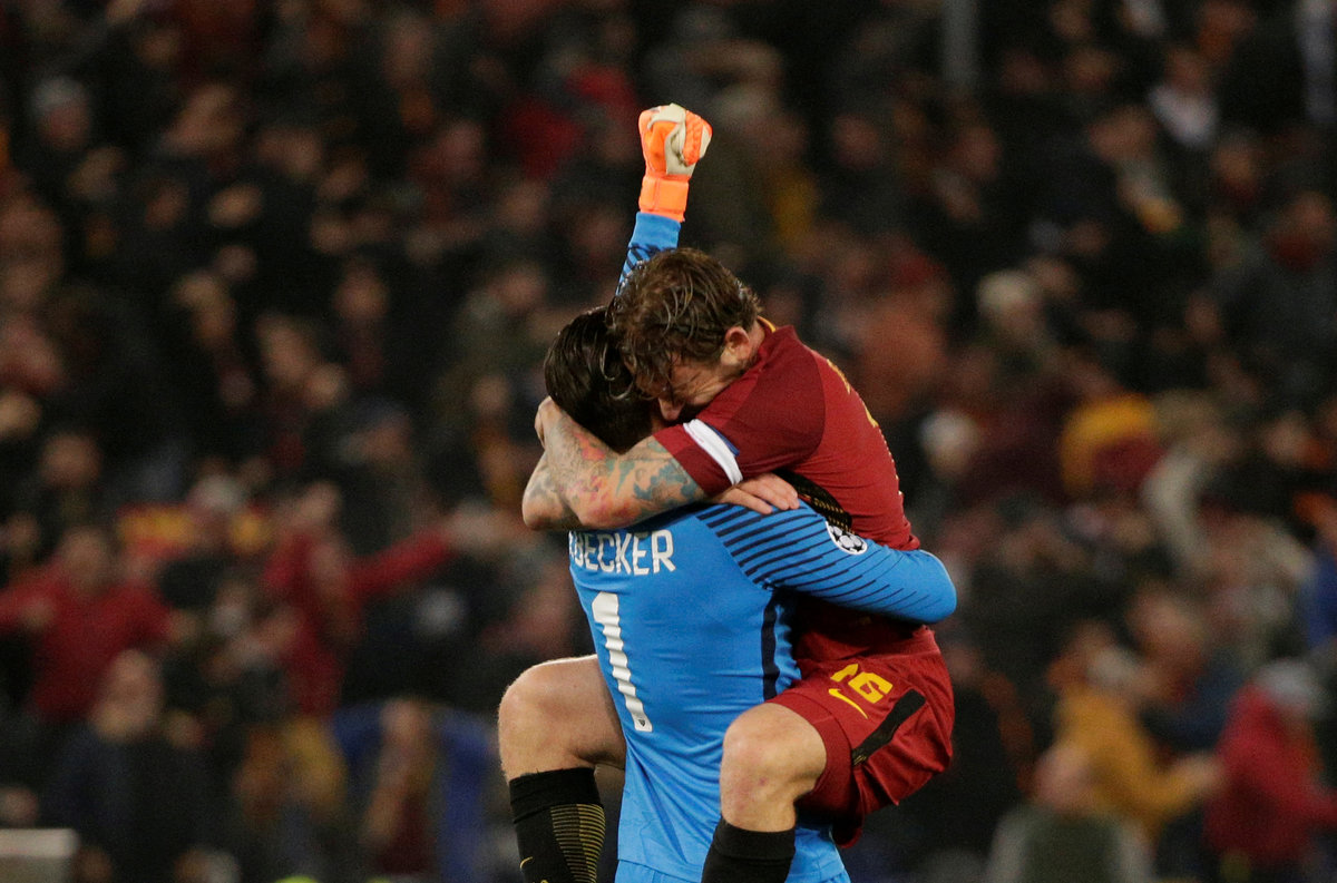 Soccer Football - Champions League Round of 16 Second Leg - AS Roma vs Shakhtar Donetsk - Stadio Olimpico, Rome, Italy - March 13, 2018 Roma's Alisson Becker celebrates with Daniele De Rossi after Edin Dzeko (not pictured) scores their first goal REUTERS/Max Rossi