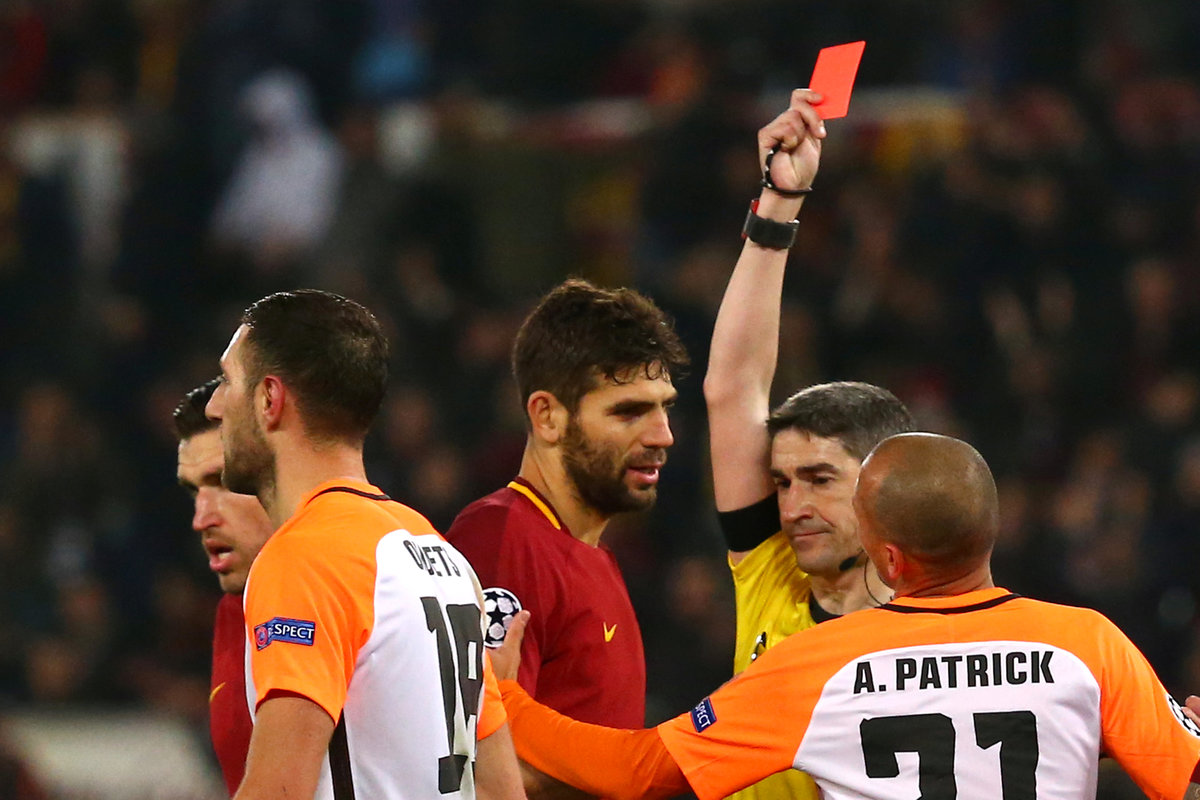 Soccer Football - Champions League Round of 16 Second Leg - AS Roma vs Shakhtar Donetsk - Stadio Olimpico, Rome, Italy - March 13, 2018 Shakhtar Donetsk's Ivan Ordets is shown a red card by referee Alberto Undiano Mallenco REUTERS/Alessandro Bianchi