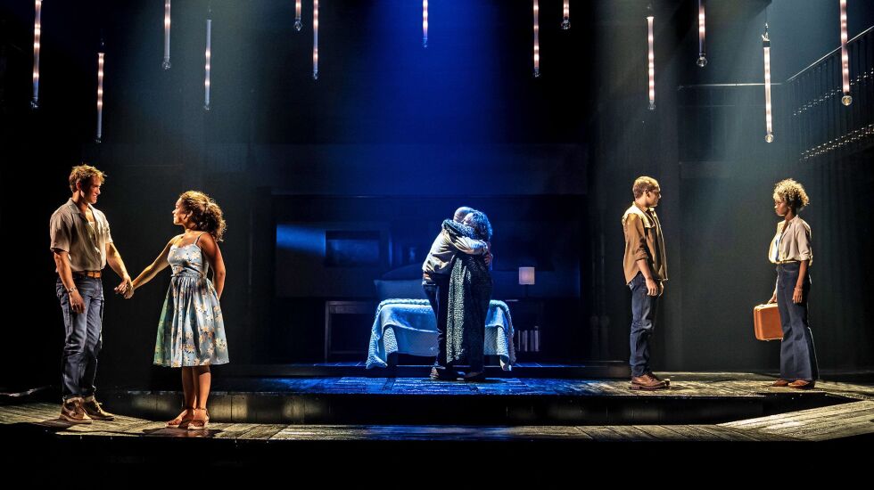 The book and score blend together so seamlessly that you can’t always tell them apart, and rather than amping this tale up to the larger-than-life, they go the opposite direction, making this more of a chamber musical about ordinary humans that also works, under the direction of Michael Greif and Schele Williams. They are assisted by an ace design team, at the Broadway scale, with mostly simple flourishes but also an impressive onstage rainstorm.