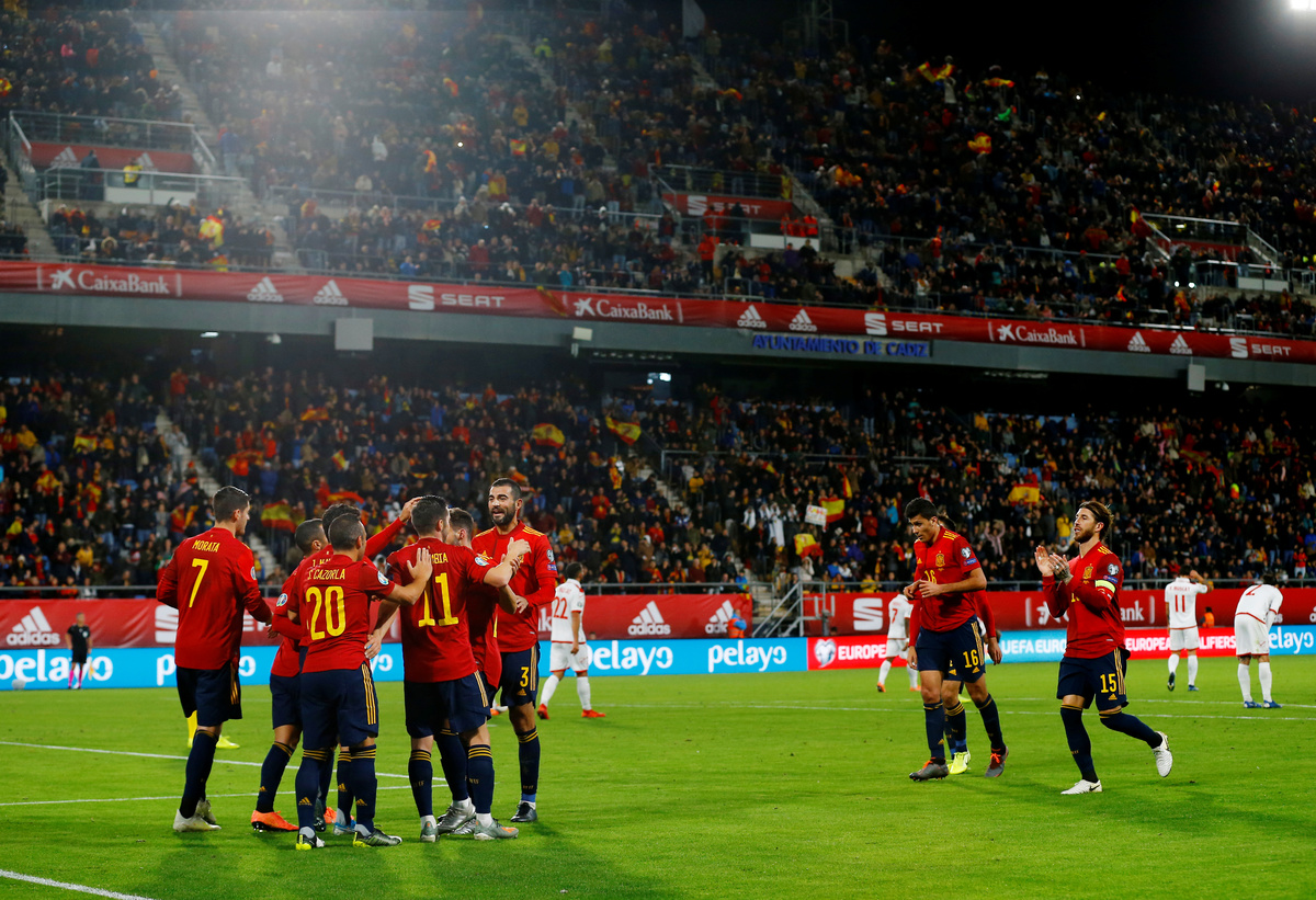 CADIZ, Spain (Reuters) - Spain clinched top spot in Group F in style by hammering Malta 7-0 at home on Friday for their biggest win of their Euro 2020 qualifying campaign as seven players got on the scoresheet.