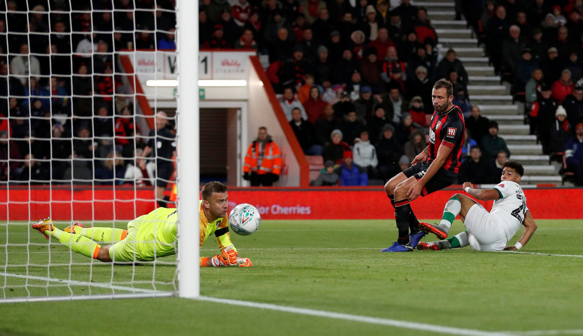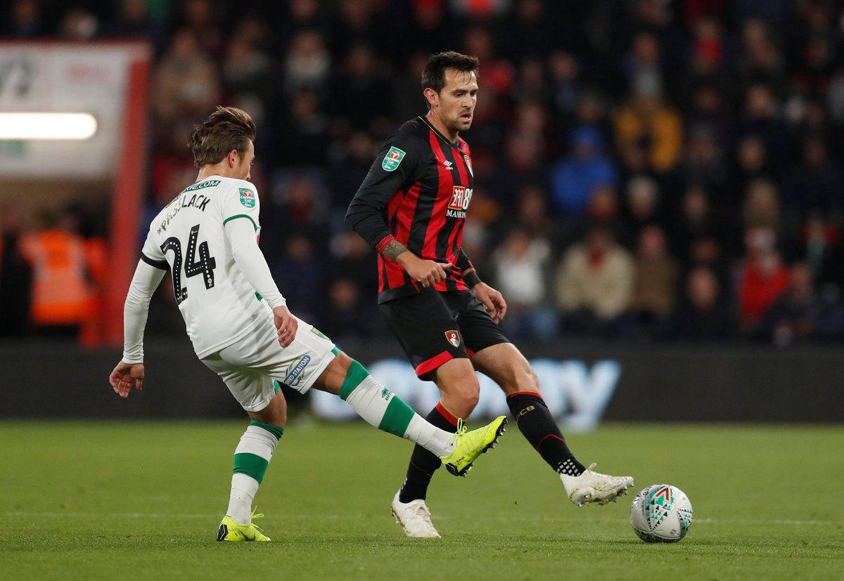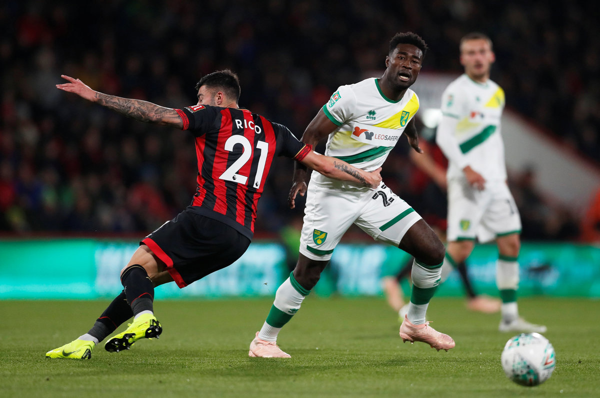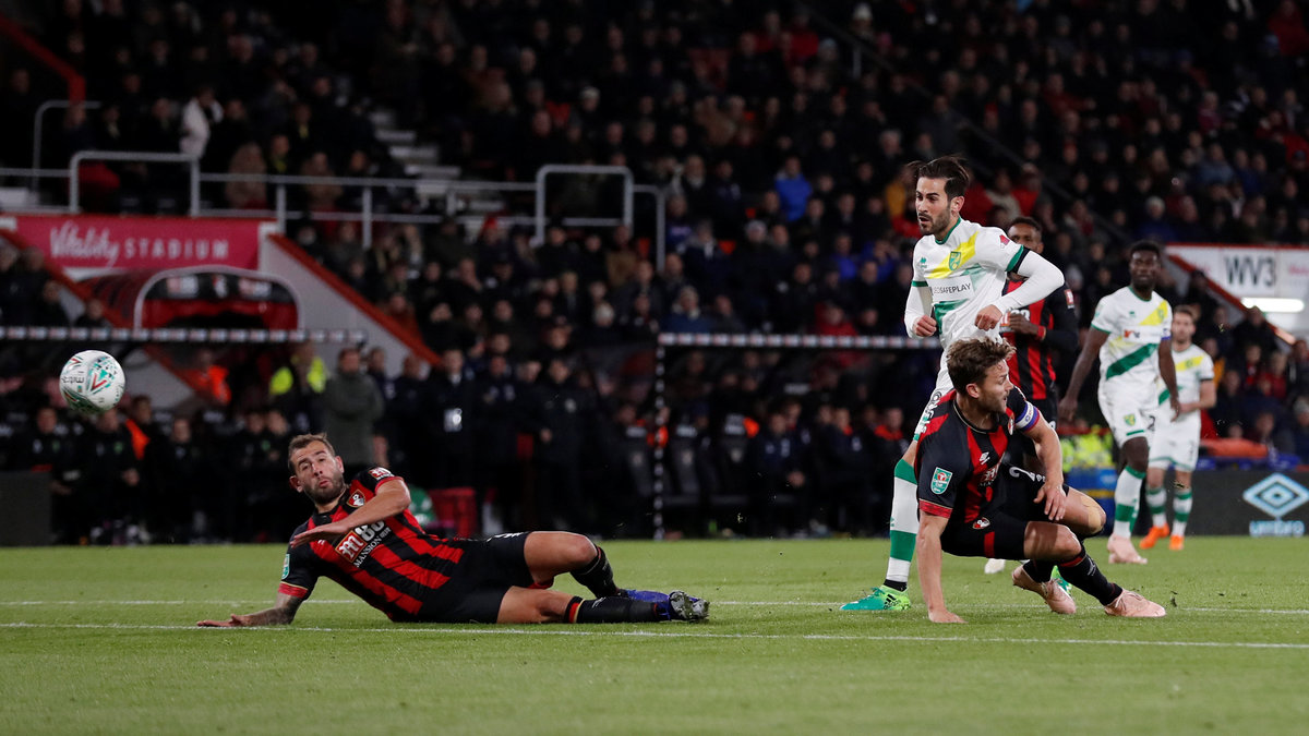 Soccer Football - Carabao Cup Fourth Round - AFC Bournemouth v Norwich City - Vitality Stadium, Bournemouth, Britain - October 30, 2018 Norwich City's Tom Trybull in action with Bournemouth's Marc Pugh Action Images via Reuters/Matthew Childs Soccer Football - Carabao Cup Fourth Round - AFC Bournemouth v Norwich City - Vitality Stadium, Bournemouth, Britain - October 30, 2018 Bournemouth's Charlie Daniels in action with Norwich City's Felix Passlack Action Images via Reuters/Matthew Childs Soccer Football - Carabao Cup Fourth Round - AFC Bournemouth v Norwich City - Vitality Stadium, Bournemouth, Britain - October 30, 2018 Norwich City's Mario Vrancic shoots at goal Action Images via Reuters/Matthew Childs Soccer Football - Carabao Cup Fourth Round - AFC Bournemouth v Norwich City - Vitality Stadium, Bournemouth, Britain - October 30, 2018 Bournemouth's Junior Stanislas scores their first goal Action Images via Reuters/Matthew Childs Soccer Football - Carabao Cup Fourth Round - AFC Bournemouth v Norwich City - Vitality Stadium, Bournemouth, Britain - October 30, 2018 Bournemouth's Diego Rico in action with Norwich City's Alexander Tettey Action Images via Reuters/Matthew Childs
