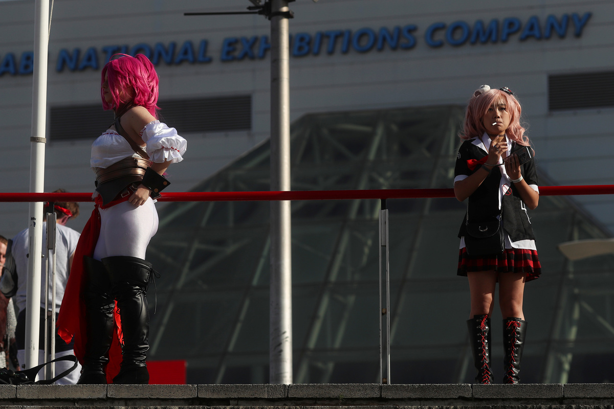 Attendees, dressed as their favourite comic characters for the MCM London Comic Con, sit outside the Excel Centre in London, Britain, October 26, 2018. REUTERS/Simon Dawson