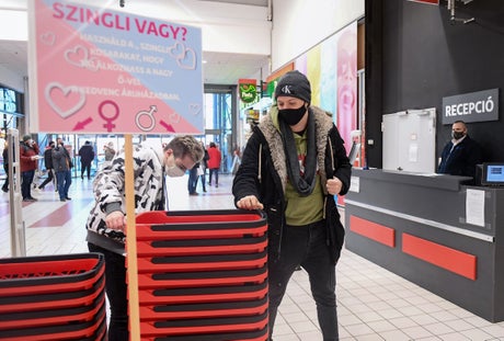 The Auchan supermarket, which is located in Csomor, east of Budapest, has filled its shop front with blue and pink shopping baskets that read “Single Seeking Mate” in Hungarian.