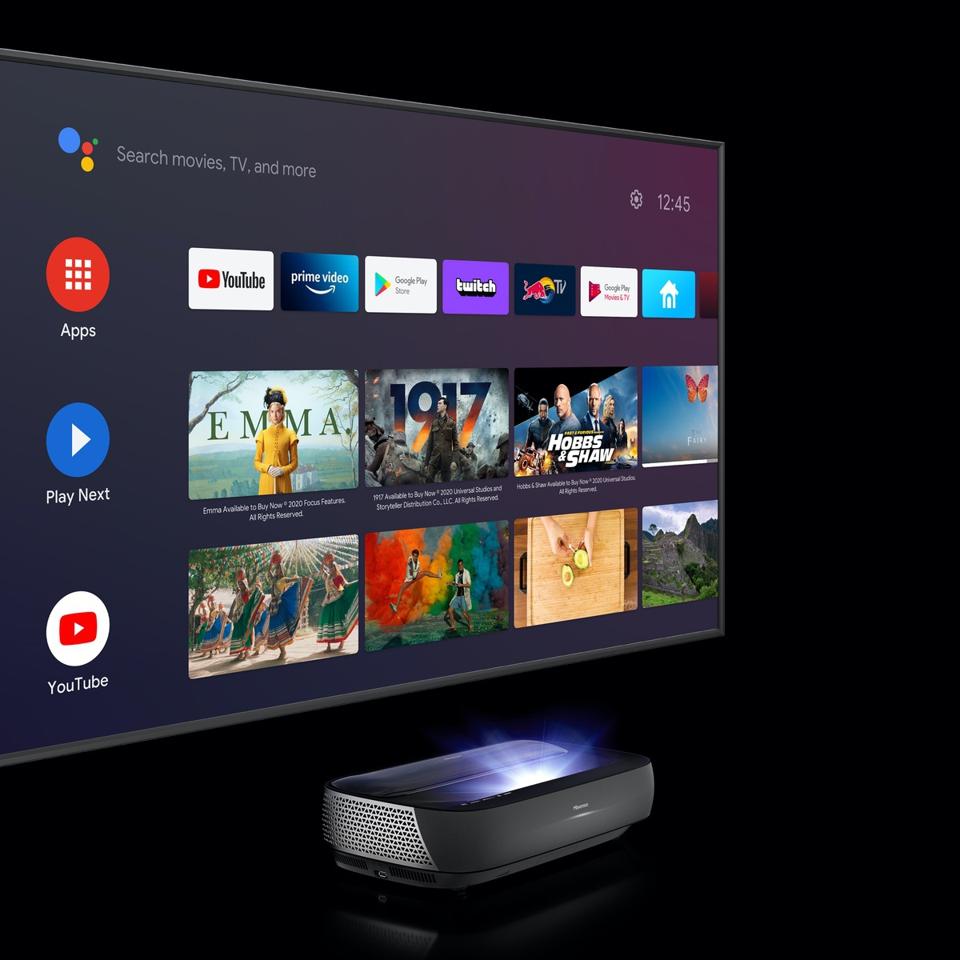 Inside the L9G TriChroma Laser TV, the operating system is based on the Android TV OS which offers more than 5,000 apps and games, including Hulu, YouTube, Prime Video, Netflix, Disney+, HBO Max and many more. Free-to-air channels are also provided by Android TV and the unit includes Google Assistant, so consumers can use the voice remote to search for programs and find what they would like to watch. The L9G also works with Amazon Alexa and is Control4-certified so it can be easily integrated with other smart home IoT devices and control systems.
