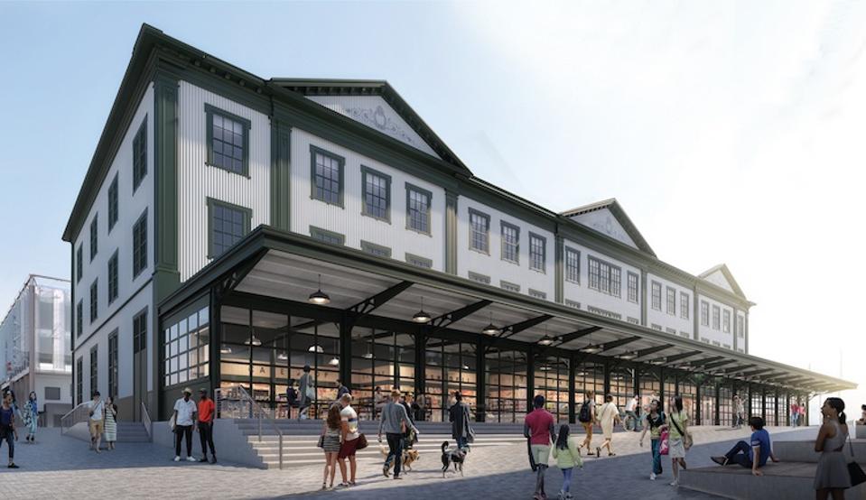 The historic Fulton Fish Market was the Tin Building in the South Street Seaport and will soon become a 53,000-sq.-ft. fresh food market run by chef Jean-Georges. He will operate around six restaurants in the complex, including Chinese (The House of the Red Pearl), Italian, a raw bar, a sushi bar, a beer garden, a taco restaurant, a vegan restaurant, and a candy store. They will also feature a private cooking space for visiting Chef collaborations and events.