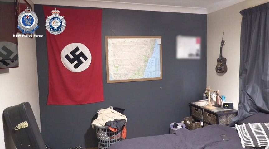 A Nazi flag can be seen hanging on the wall of a bedroom in vision released by the JCTT.