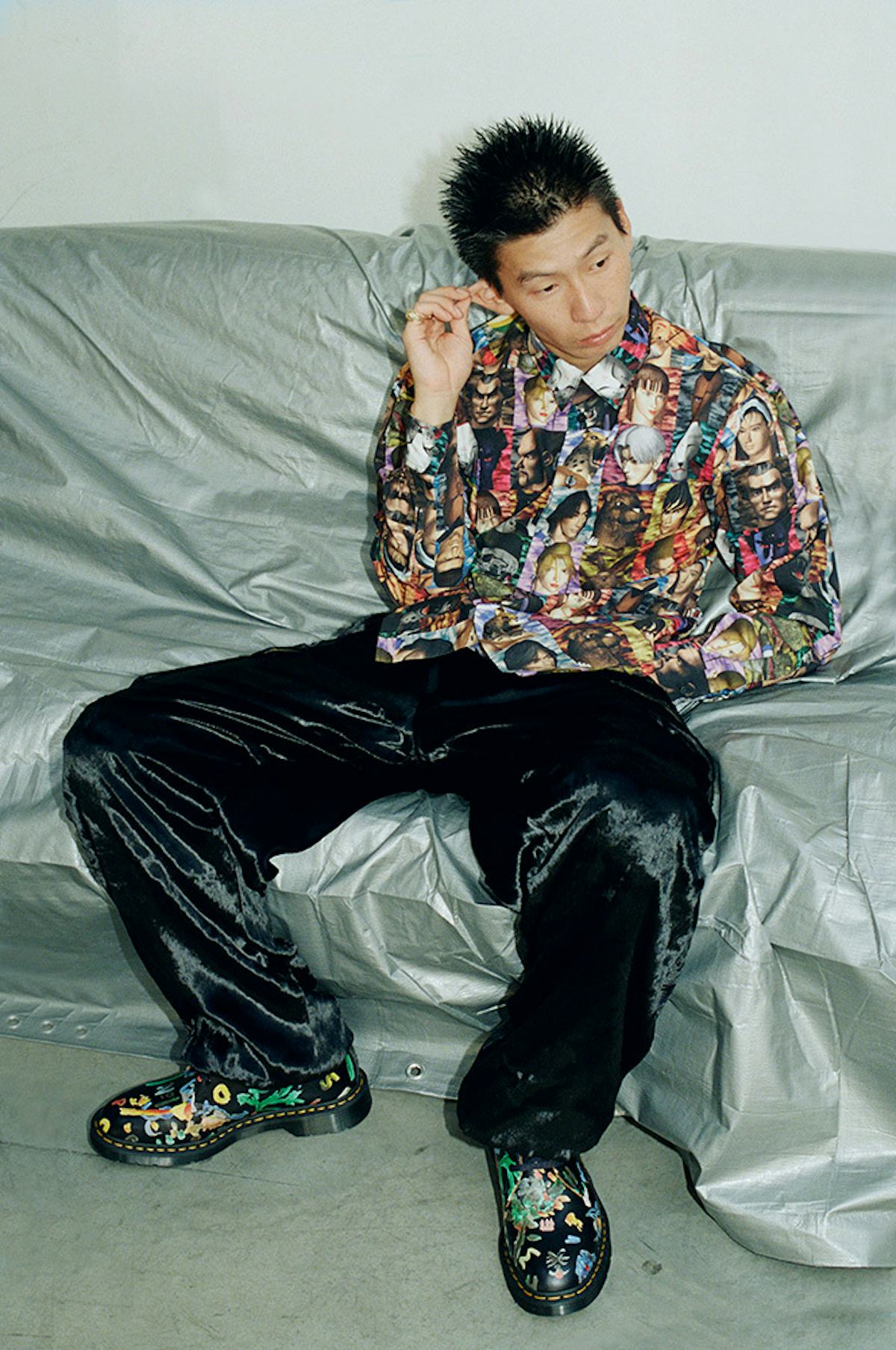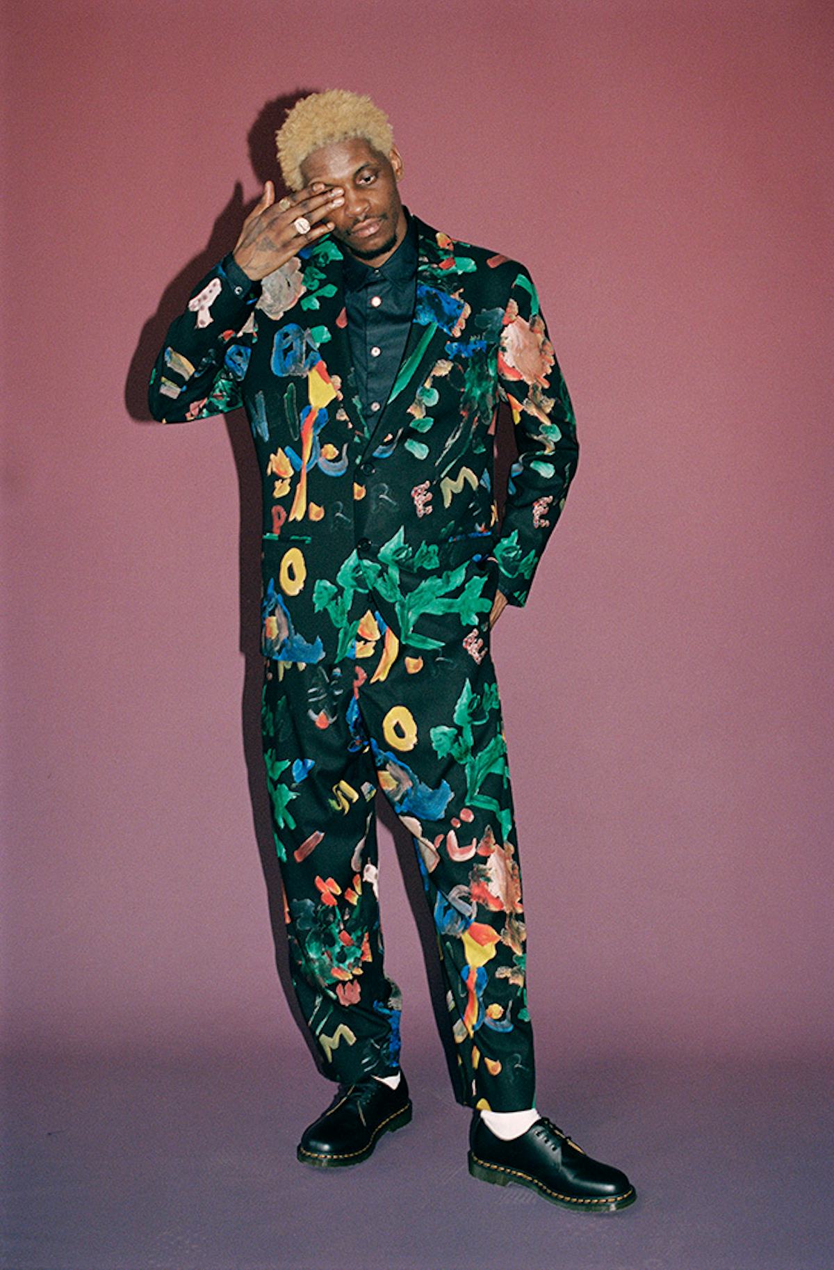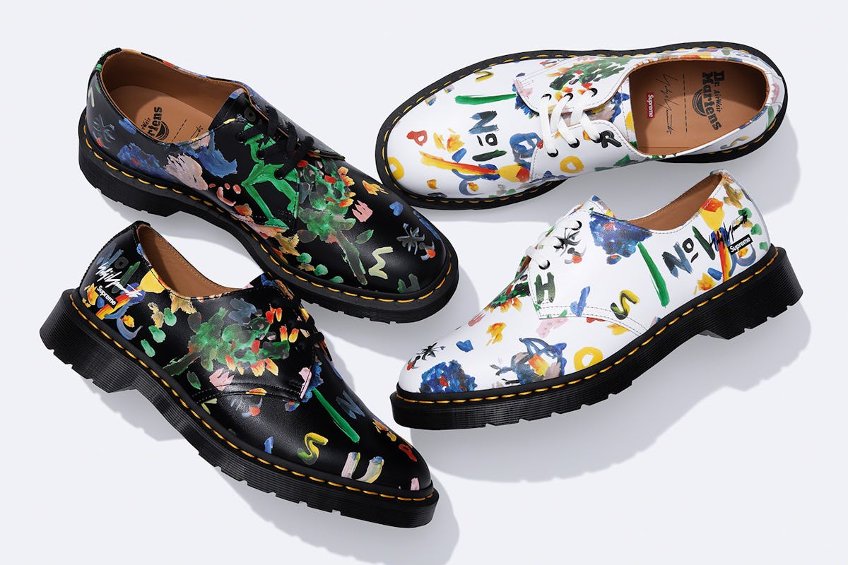 For a more formal look, the duo adds a bold suit dressed in a bright paint motif, knit sweaters, and formal footwear. Dr. Martens even lends its 1461 3-Eye loafer to the collab. The black or white base is covered in the same paint graphics as the suit (and a T-shirt elsewhere in the capsule). A beanie serves as the primary accessory in black or beige with Yamamoto’s script as the main graphic.
