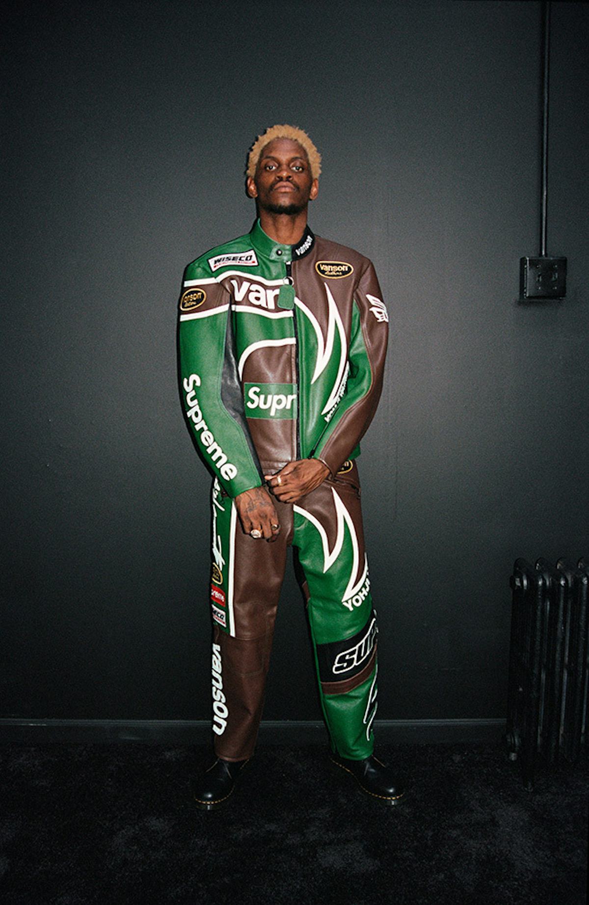 If Tekken isn’t your thing, and you’re just here for the Yohji Yamamoto cosign, the rest of the collection features motocross-inspired and co-branded pieces. Vanson leather jackets with matching pants contribute to the biker vibe, complete with color-blocked panels and strategic branding. A striped Baja jacket offers a more laidback alternative with a hit of co-branding on the back, and T-shirts feature paint designs and pumpkin graphics just in time for spooky season.
