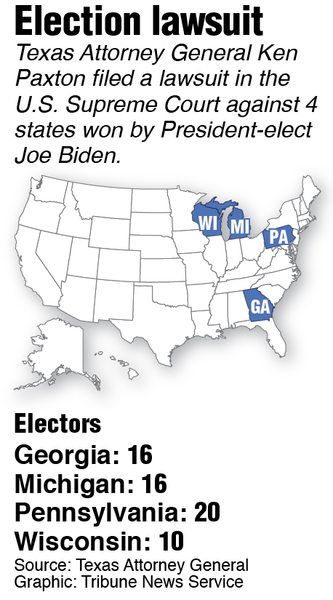 But in a separate bid filed late Monday, the state of Texas asked the court for leave to sue the state as well as Georgia, Michigan and Wisconsin for what Texas Attorney General Ken Paxton called "significant and unconstitutional" irregularities that cast the results into doubt in all four battleground states.