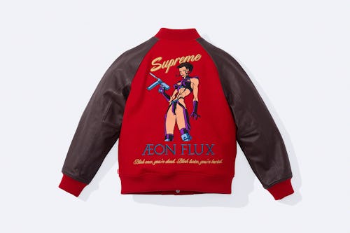 While the show’s Aeon Flux character embodies over-sexualization of female characters — as many were in the ‘90s — Supreme has incorporated her original likeness and other details onto its pieces. The collection is set on a mix of layering pieces and outerwear options and given a color palette that blends neutral shades with bolder hues.