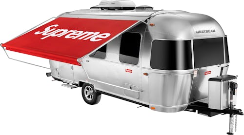 If Supreme is a way of life, hypebeasts will soon be able to live in it quite literally with the revelation of a heavily branded Airstream travel trailer. The aluminum mobile home comes with built-in red leather “Supreme” seating and no shortage of Box Logos on the interior and exterior, including a “Bogo” awning.