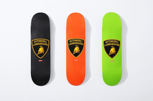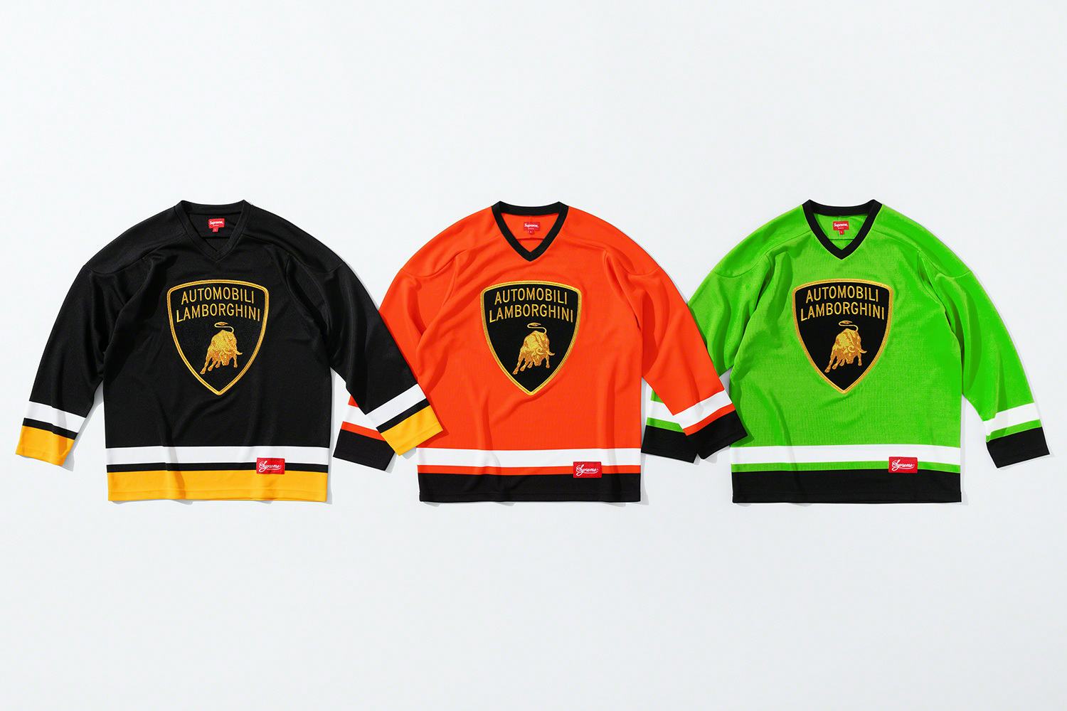 Perhaps bad is harsh, but the rest of the gear is significantly less stimulating. The T-shirts (coming in white, black, and orange) are plain obvious: Supreme block letters up front and big Lambo logo out back. Ditto for the beanies, which swap block letters for the script. Reverse the logo placement, Supreme in front and Lambo in back, and you've got the hockey jerseys. The skateboards, once again, keep the same black, orange, and green color offerings with a big Lambo logo atop a tiny box logo.