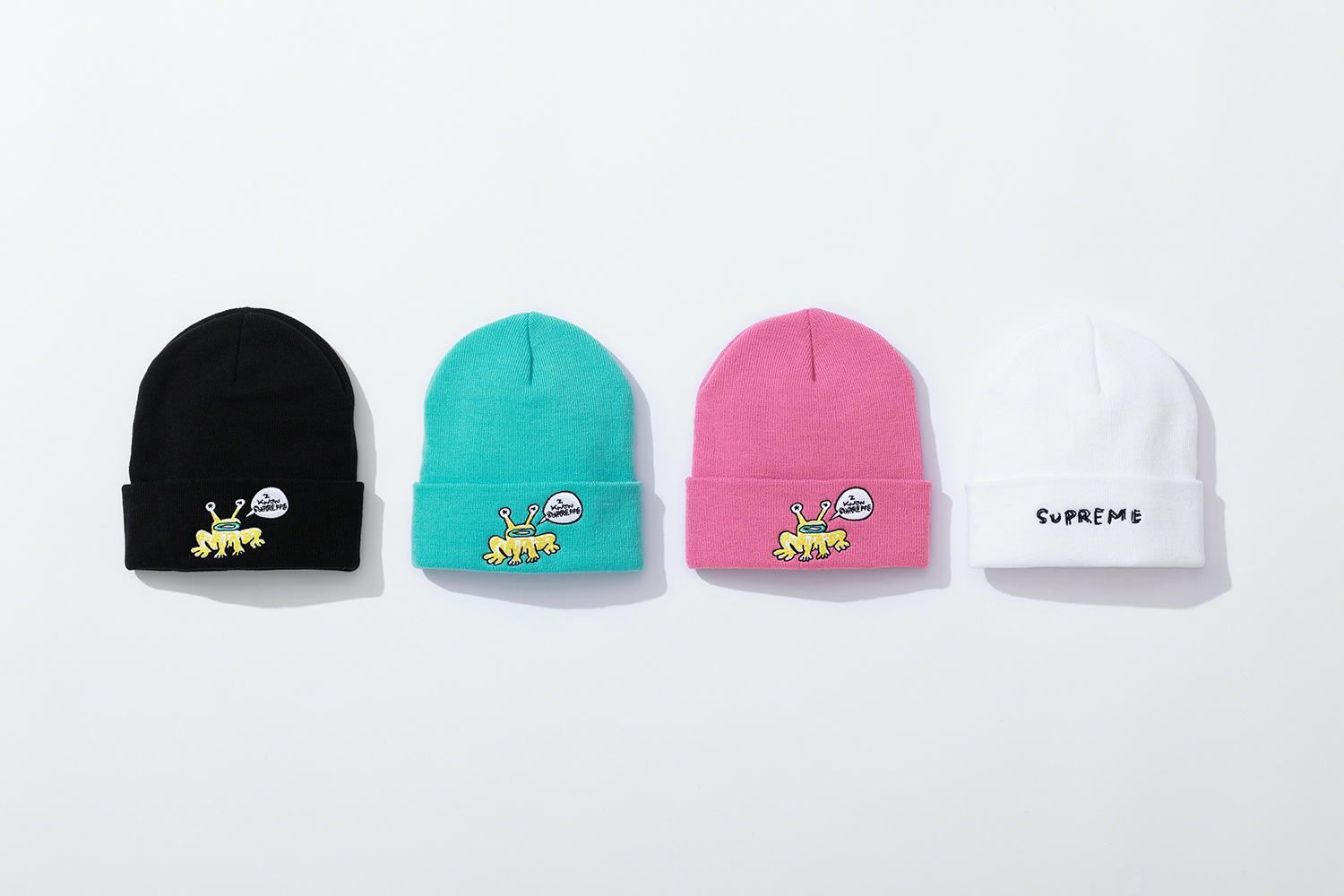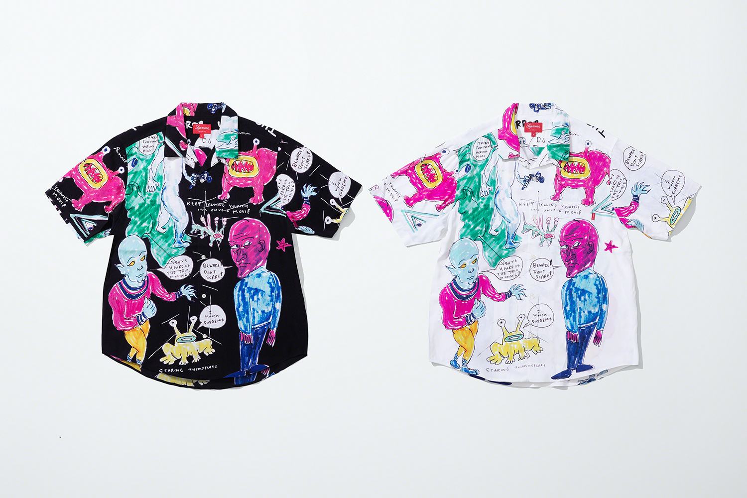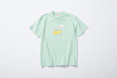 Among the work is Johnston's "Jeremiah the Innocent" frog, which appeared on his Hi, How Are You? album cover and was famously worn on a T-shirt by Kurt Cobain. Here, he's been given a speech bubble that reads, "I know Supreme." If anything's destined to sell out before you know it, it's the flannel, T-shirt, and pants featuring his signature alien-like creation.