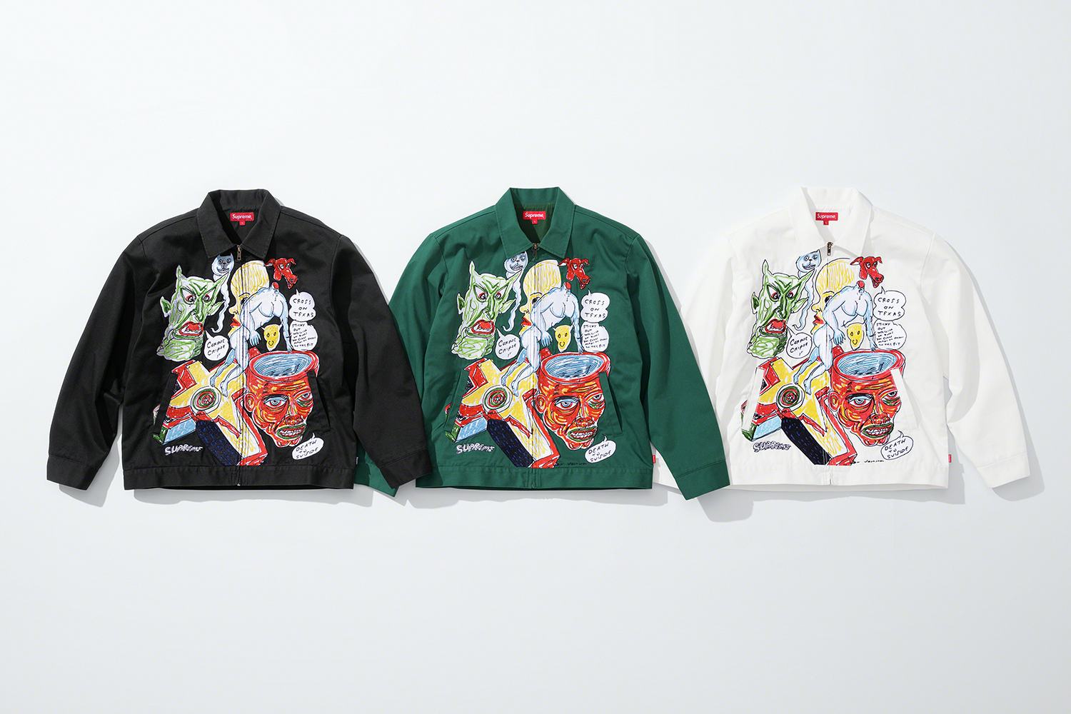 The posthumous work marks the second time Johnston's work has been used in a collaborated with Supreme. A 2012 capsule featured three of his drawings on T-shirts, but this collection is much more expansive with work jackets and pants, rayon and plaid shirts, hoodies, T-shirts, and beanies.