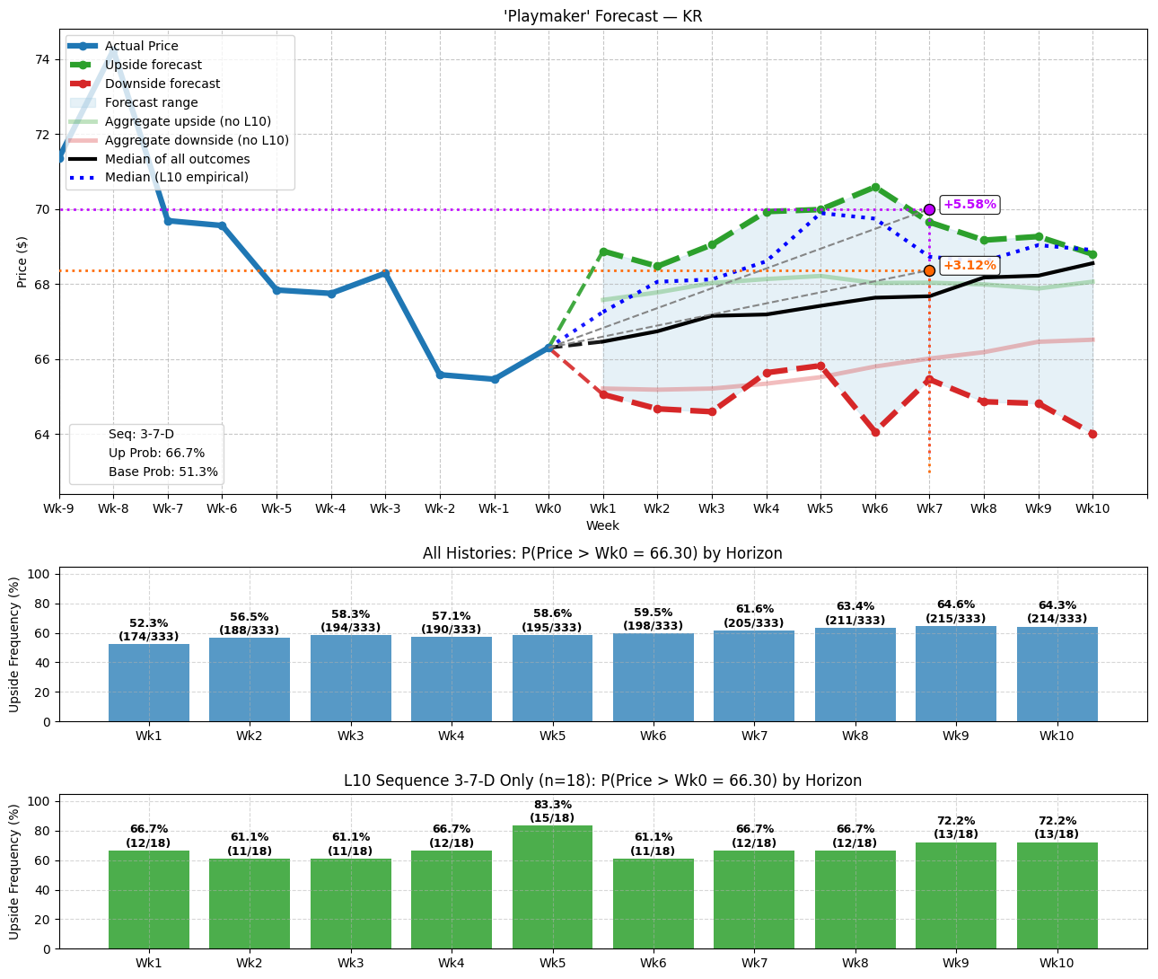 Because of the recalculation of assumptions, many securities exhibit buy-the-dip sentiments when the 3-7-D — or other distribution-heavy sequences — flash, making them exciting prospects for debit-buying speculators. In the case of KR stock, there’s a high probability that over the next several weeks, not only will the equity rise but that the median price of conditional outcomes will typically land above the expected median associated with baseline conditions.