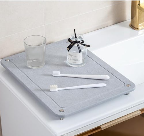 An absorbent stone faucet mat that keeps the area around your sink dry