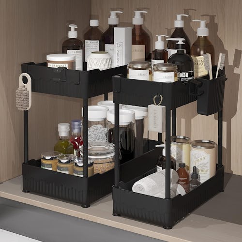 If the area under your bathroom or kitchen sink is a messy black hole of cleaning supplies, toiletries, and storage, you need to check out these organizers. Each organizer holds up to 50 pounds and has two shelves with raised edges to store all your essentials and keep them secure. Plus it comes with a detachable basket and multiple hooks to further organize your space.