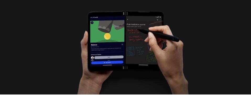 I will give an example of how the Surface Duo 2 is increasing my mobile productivity. Currently, I am typing this blog on the Surface Duo 2 using a Logitech K480 with the Surface Duo vertically. I have Word opened at the top in the Office app, and I have my notes open at the bottom in OneNote. The difference between using the Surface Duo 2 over a device like the iPhone is that I cannot only type on a larger canvas thanks to the screen real estate, but I can have other apps open, and I don’t have to switch between apps constantly.