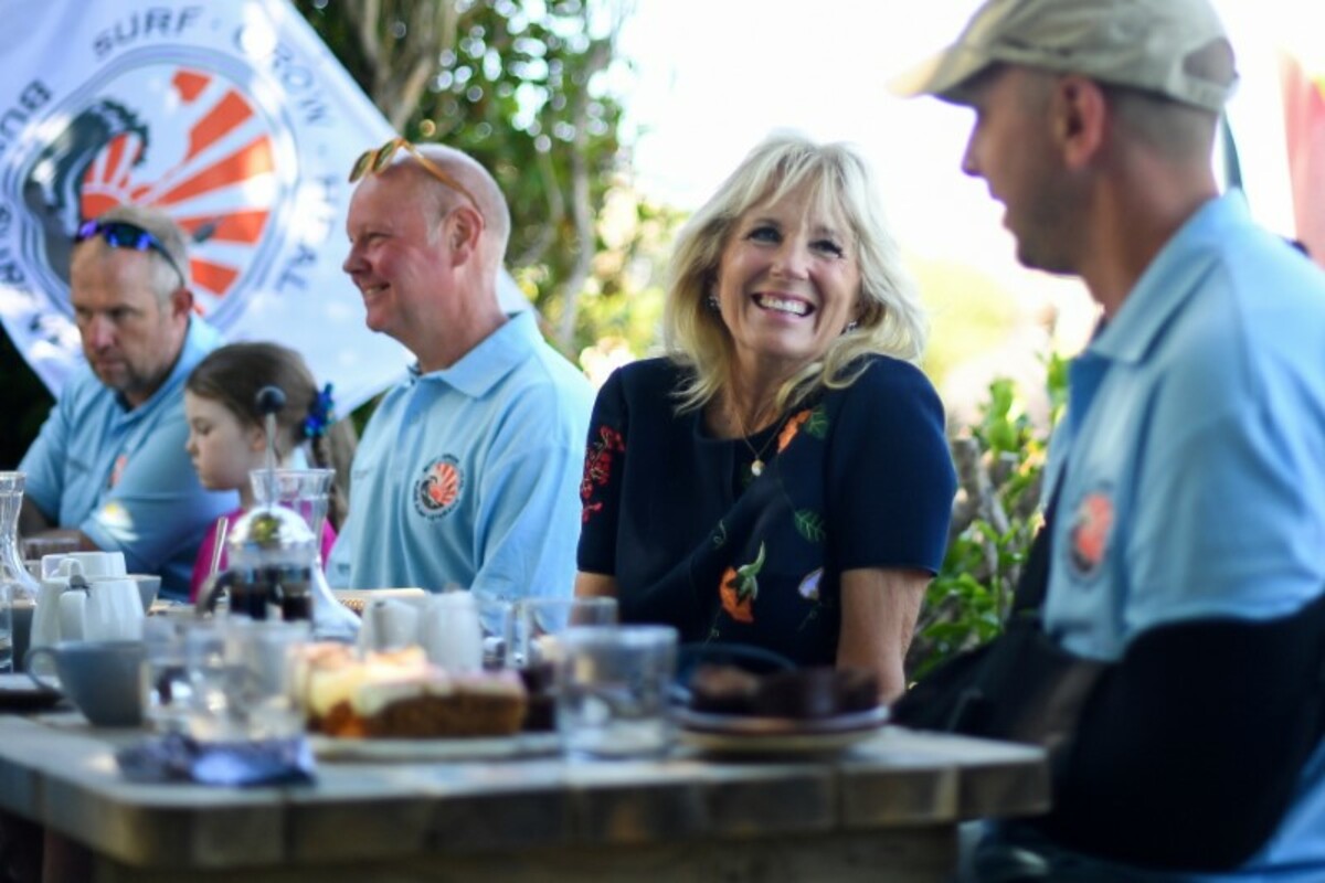 U.S. first lady Jill Biden revealed on Saturday she owned a white surfboard with a big butterfly on it as she met with a group of British military veterans and first responders who take to the sea to recover from the stresses of life.