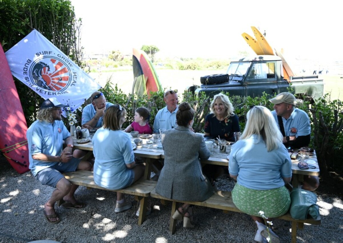Biden was meeting the Bude Surf Veterans, volunteer providers of social support and surfing excursions for veterans, first responders and their families. The group has the slogan: Surf, Grow, Heal.
