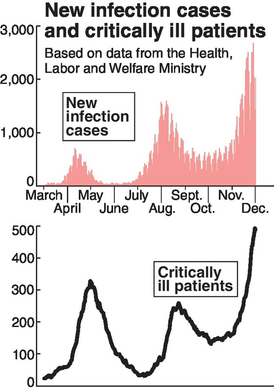 That has led to the surge in critically ill patients, putting pressure on frontline medical facilities. According to statistics compiled by the Tokyo metropolitan government, 31 of 34 deaths reported in November were people aged 60 and over, while 30 had preexisting conditions.