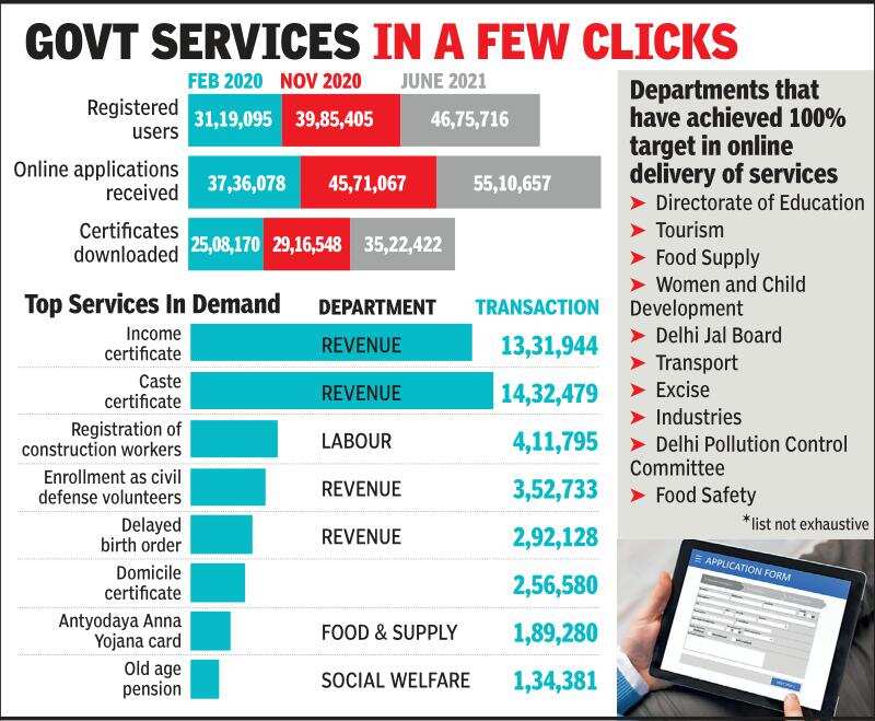 NEW DELHI: During the Covid-19 pandemic, the online delivery of services like income, caste and birth certificates has come to the rescue of lakhs of Delhiites. While till February 2020, 37 lakh applications were received across 11 districts, it increased to 55 lakh by June 2021. Similarly, till February 2020, 25 lakh certificates were downloaded while the count crossed 35 lakh by June 2021.