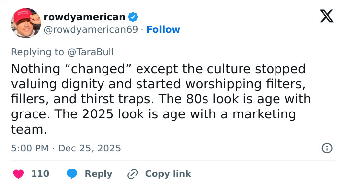 “Nothing ‘changed’ except the culture stopped valuing dignity and started worshipping filters, fillers, and thirst traps,” one observer responded. “The 2025 look is ‘Age with a marketing team.’”