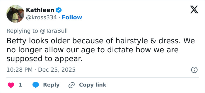 “Betty looks older because of hairstyle & dress. We no longer allow our age to dictate how we are supposed to appear,” one viewer noted.