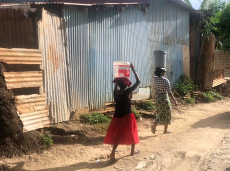 While ocean waves lap empty beaches and police patrol the quiet streets of Mamoudzou’s business district, many people in Soilihi's Bandrajou neighborhood seem unaware of lockdown rules or social distancing measures. Clusters of children play barefoot on the dusty ground, girls carry buckets on their heads to fetch water from a collective pump, an older woman at an informal street stall braids a younger woman’s hair. Almost no one wears a mask.