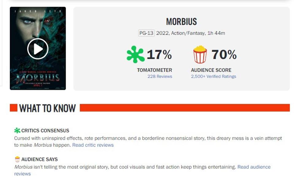 Morbius currently has a 17% on Rotten Tomatoes and a 70% audience score.