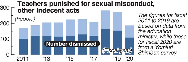 At least 186 teachers at public elementary, junior high and high schools, and special-needs schools were dismissed or disciplined in fiscal 2020 for sexual misconduct against students and others, a nationwide Yomiuri Shimbun survey has found.
