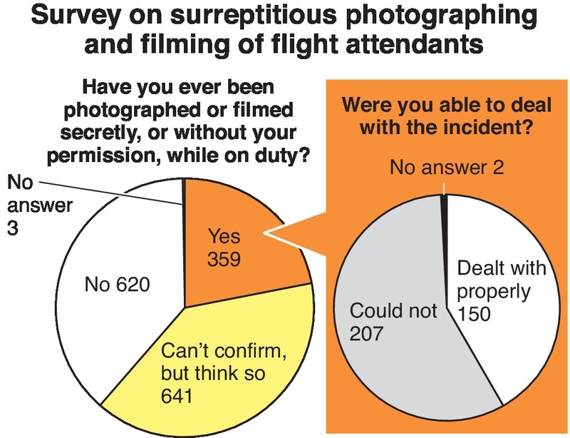 Of the 359 cabin crew members who answered they have been secretly photographed or filmed, only about 40 percent dealt with cases by such means as handing offenders over to police or making them delete the data in question.