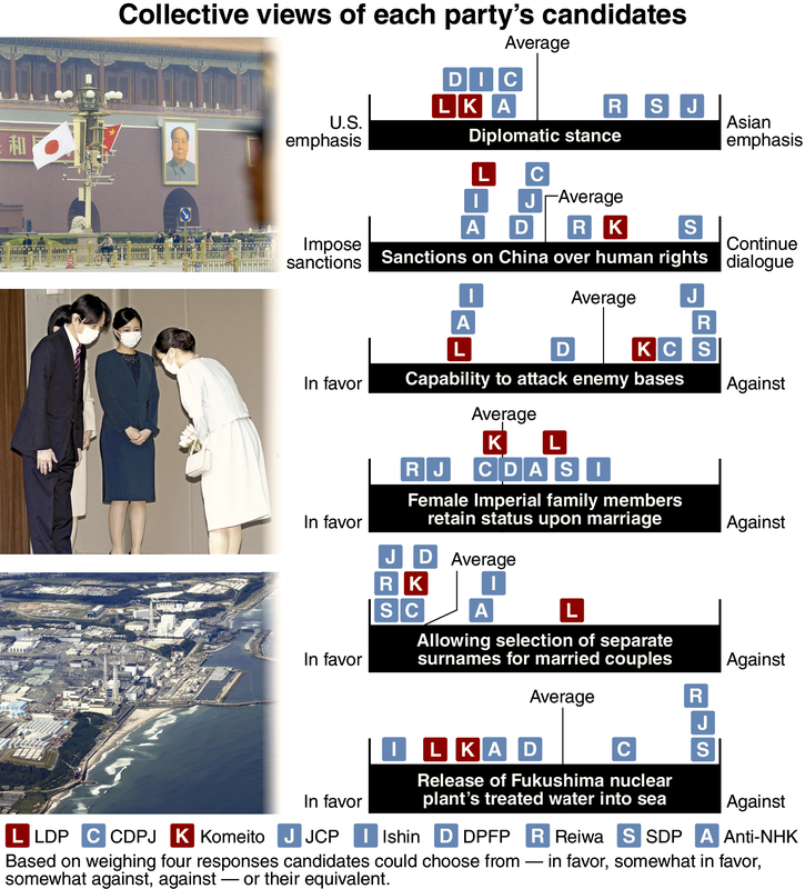 A Yomiuri Shimbun survey on candidates running in the upcoming House of Representatives election has shown clear differences among the parties regarding foreign and security policies.