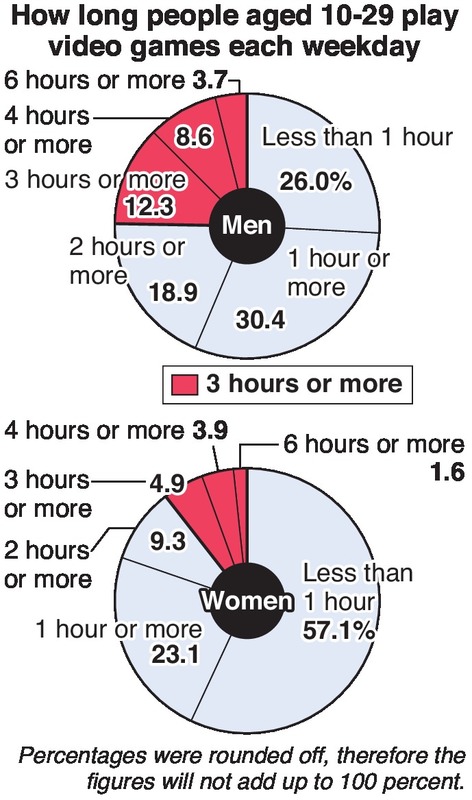 By gender, 24.6 percent of male respondents and 10.4 percent of female respondents said they spend three hours or more. The percentage of people who play games for three hours or more on holidays was 37. 8 percent. More than 20 percent of all respondents answered that sometimes they could not stop playing when they were supposed to.