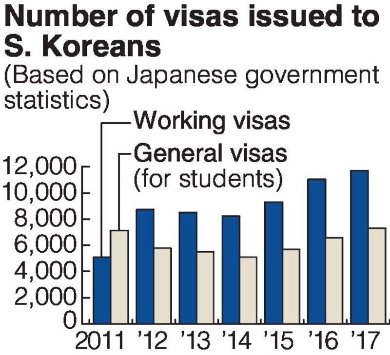 According to the Japan National Tourism Organization, the number of South Korean visitors to Japan in 2017 jumped about 40 percent from the previous year, reaching a record high of about 7.14 million.