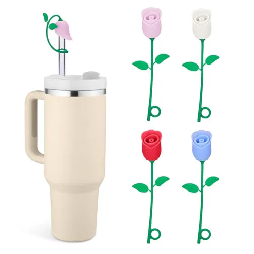 Straw Cover Cap for Stanley Cup, Cute Straw Toppers Compatible with 20 30 40 Oz Tumbler, Cute Silicone Rose Flower, Fit 6 8 10mm Straws Accessories for Women Kids Gift, Red Pink Blue White