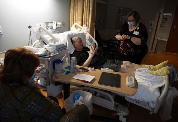 Every day he requests a visit from the spiritual care team. On a recent afternoon, Doubet brought him a Communion cup. They said the Lord's Prayer together: "Thy kingdom come. Thy will be done." Janet Morso's hands were folded below her mask to pray.